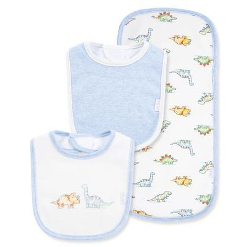 Lo que toda mamá quiere. Este juego temático Dinos maravillosamente suave y fácil de limpiar incluye 1 babero bordado, 1 babero a rayas y 1 paño para eructar estampado con forro de felpa.