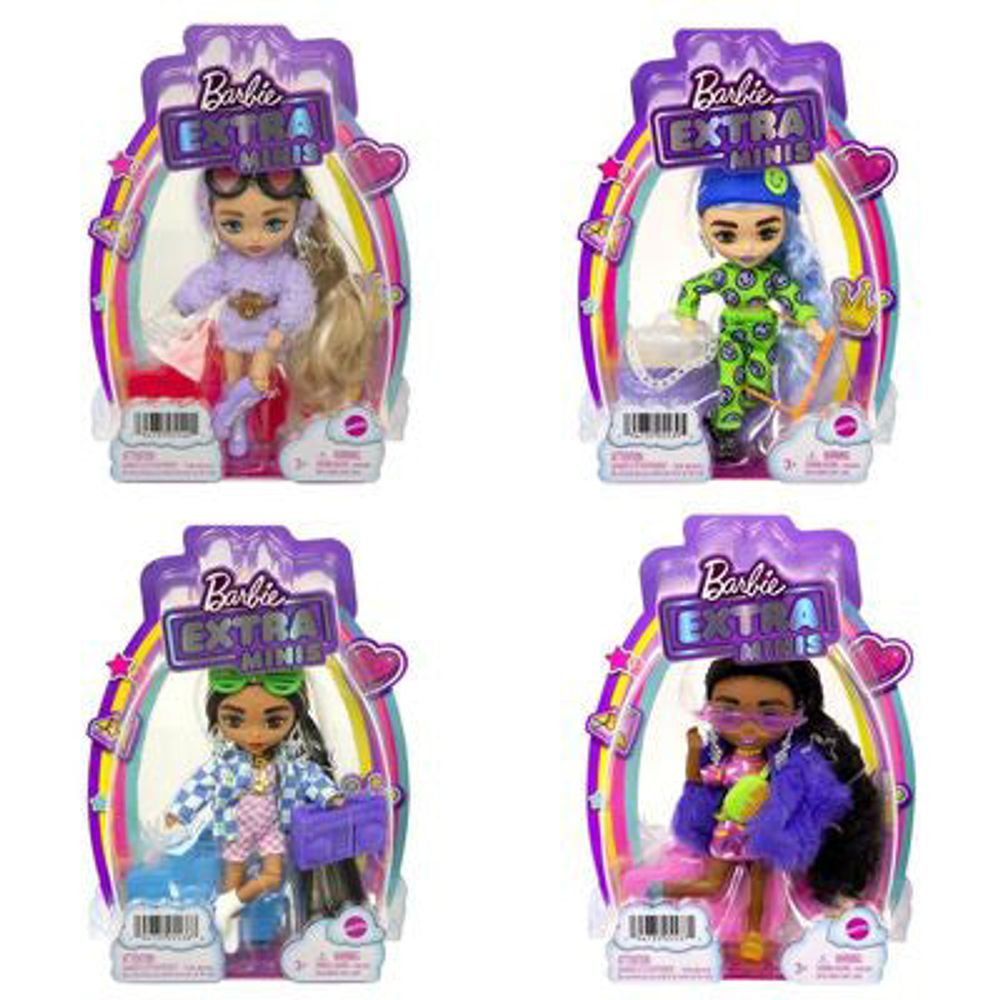 Conoce a las muñecas más EXTRA pequeñas: Barbie® Extra Minis™. Son como las exageradas muñecas Barbie® Extra, ¡pero en miniatura! Estas muñecas de 5,5 pulgadas, articuladas y juguetonas con un aspecto hecho para matar, son mini con personalidades y estética de gran tamaño. Cada muñeca viene con cabello enraizado extralargo, moda divertida y accesorios exagerados. ¡Con posibilidades en los codos y las rodillas, estas pequeñas muñecas están listas para adoptar una pose! ¡Y con un puesto de muñecas para cada una, las niñas pueden crear su propia exhibición de Barbie® Extra Minis™! Minimizadas con vibraciones adicionales, estas pequeñas muñecas hacen una GRAN declaración. ¿Puedes decir oh-mi-MINI? Cada uno se vende por separado, sujeto a disponibilidad. Las muñecas no pueden estar solas. Los colores y las decoraciones pueden variar.