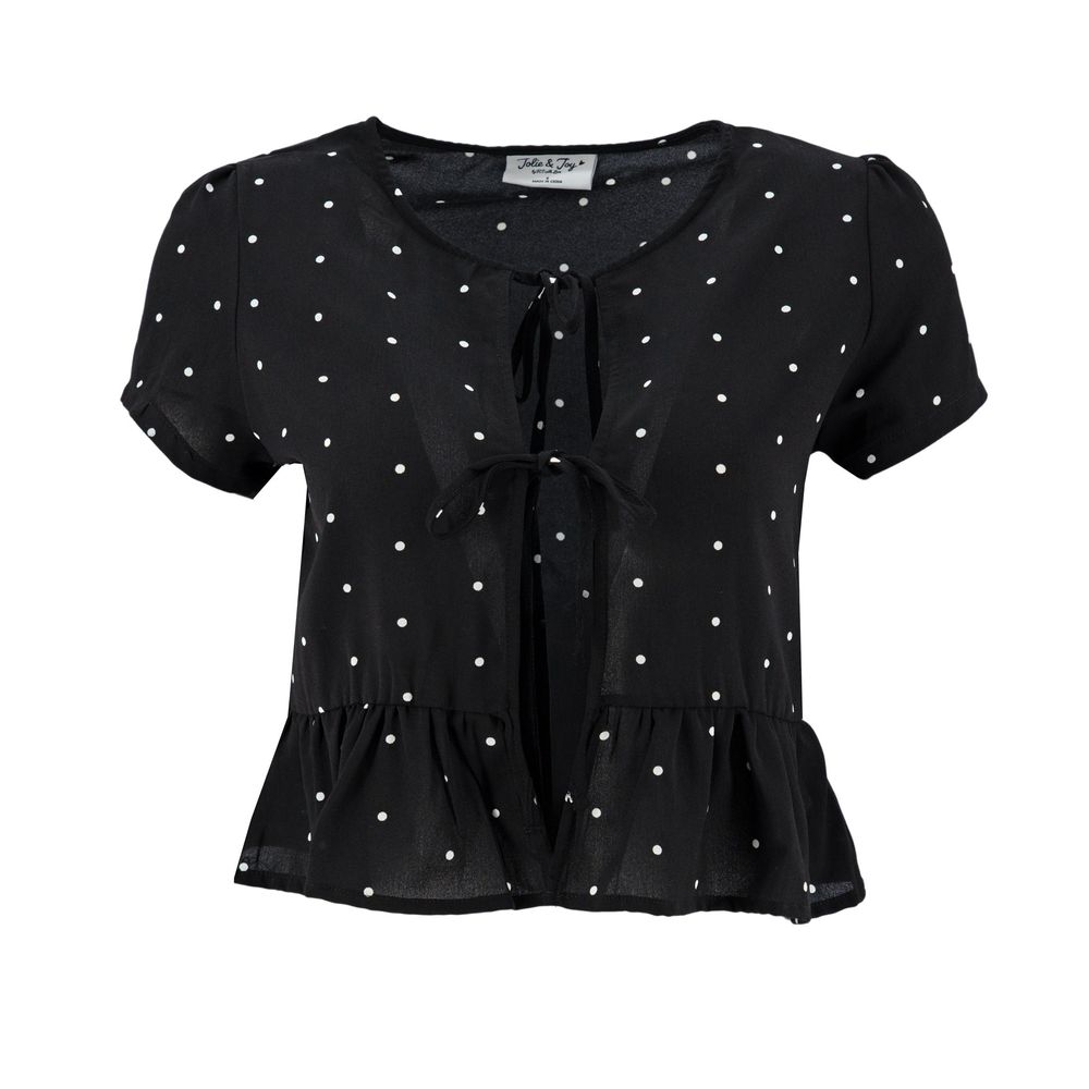 Esta blusa Jolie & Joy de mangas cortas con diseño de puntos para damas es una prenda ligera, encantadora y muy versátil, ideal para el estilo casual elegante en Santo Domingo. Confeccionada en 100% poliéster, es una opción perfecta para el clima tropical, ofreciendo frescura, un hermoso drapeado y facilidad de cuidado.