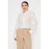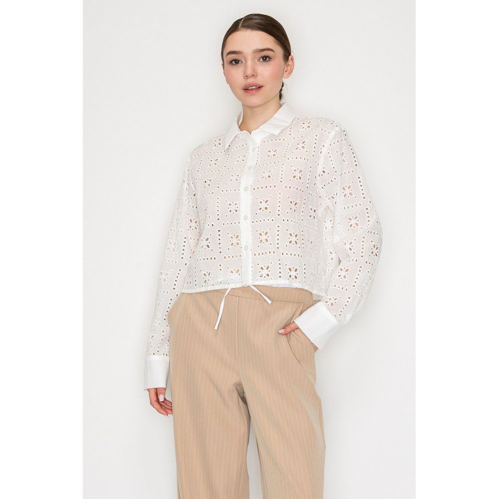 Tipo: Blusa de mangas largas con detalles de eyelet. El eyelet es un tipo de encaje bordado con pequeños orificios, lo que le da a la blusa un toque de textura y ligereza.