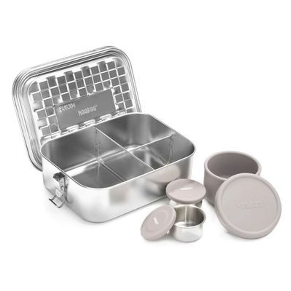 ¡Este práctico juego también viene con tres recipientes más pequeños, todos los cuales caben dentro de la lonchera y tienen tapas que se sellan de forma segura, para que pueda empacar refrigerios adicionales, salsas para mojar, purés y más!