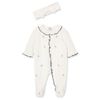 Pequeños capullos de rosa y lunares salpican un pie de bebé de algodón para niñas recién nacidas rematado con una diadema con lazo para un acabado clásico.