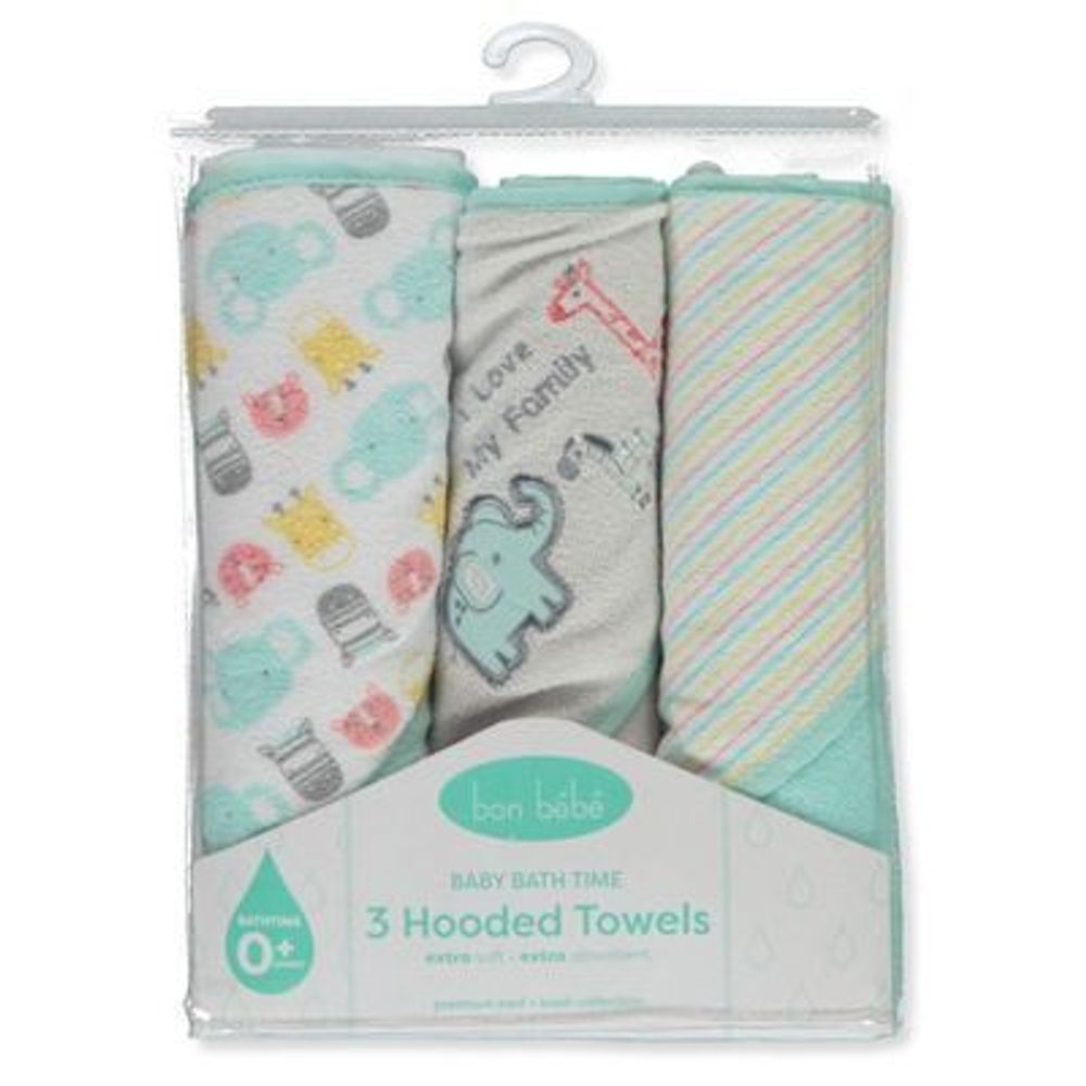Pide ya las toallas con capucha para completar la hora del baño con este paquete de 3 de Bon Bebe!. Juego de 3 toallas con capucha Bon Bebe Estampados diseños como se muestra Extra absorbente 60 % algodón, 40 % poliéster Lavar a máquina en frío