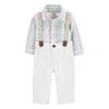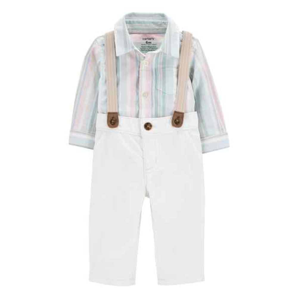Este encantador conjunto de tres piezas es imprescindible para tu pequeño. Confeccionado en 100 % algodón, suave y transpirable, garantiza comodidad durante todo el día para su delicada piel. El body con botones al frente tiene hombros superpuestos para facilitar su colocación, mientras que los broches resistentes garantizan su durabilidad tras innumerables lavados y usos. El conjunto se completa con tirantes desmontables, que le dan un toque clásico al conjunto de tu pequeño.