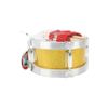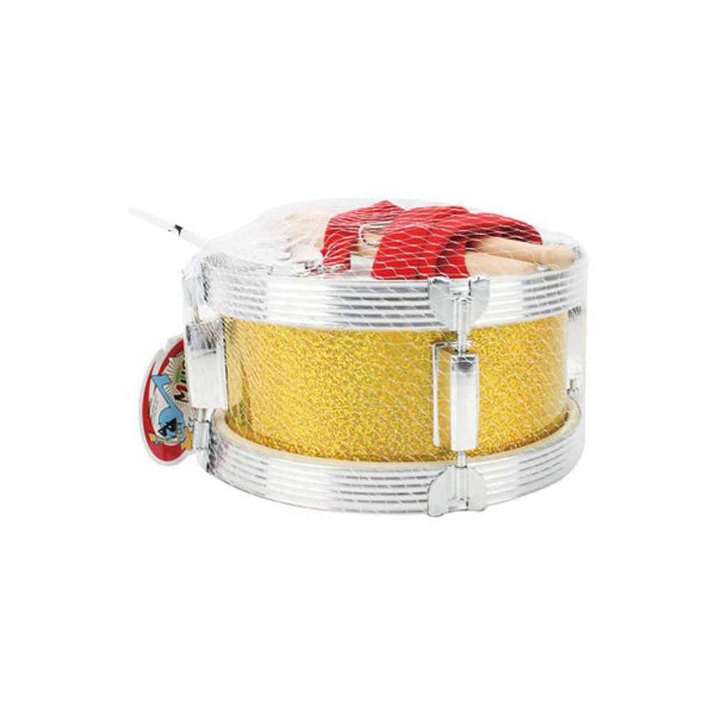 El juguete incluye: - un tambor con cuerpo de metal, - aros de aluminio, - una membrana de plástico, - un mango textil, - dos palos de madera - Dimensiones del tambor - 16 cm x 10 cm x 16 cm aprox.