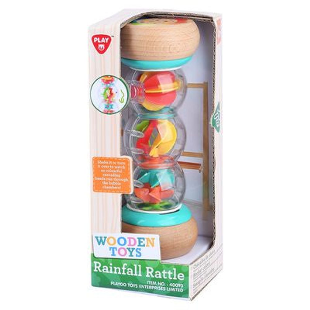El Rainfall Rattle es un sonajero de madera para bebés de 6 meses en adelante que simula el relajante sonido de la lluvia. Con esferas transparentes y cuentas de colores, estimula los sentidos, desarrolla la coordinación y brinda una experiencia sensorial divertida y calmante.