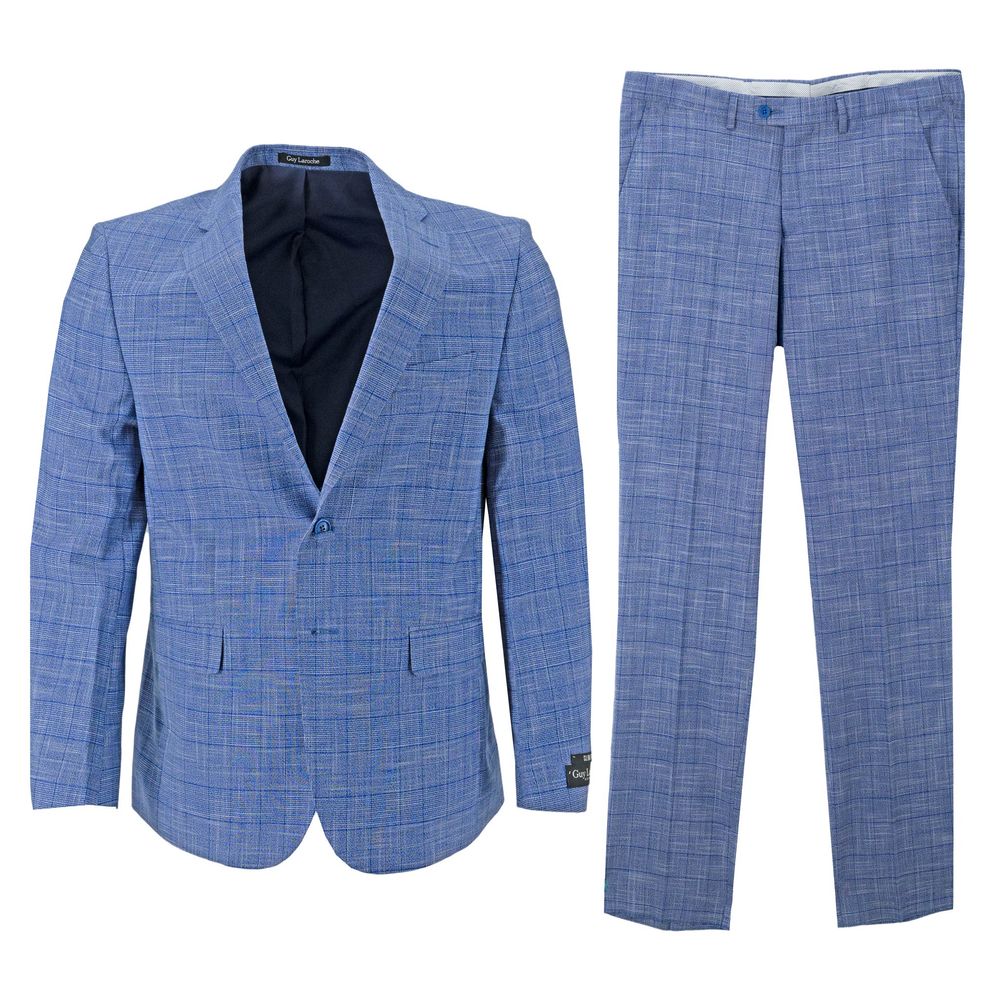 Este traje Guy Laroche de 2 botones a cuadros para caballeros es una prenda moderna y con carácter, ideal para el caballero que busca un estilo distintivo y sofisticado en Santo Domingo. Su innovadora composición de poliéster, viscosa y elastano lo convierte en una opción práctica y estilizada para diversas ocasiones.
