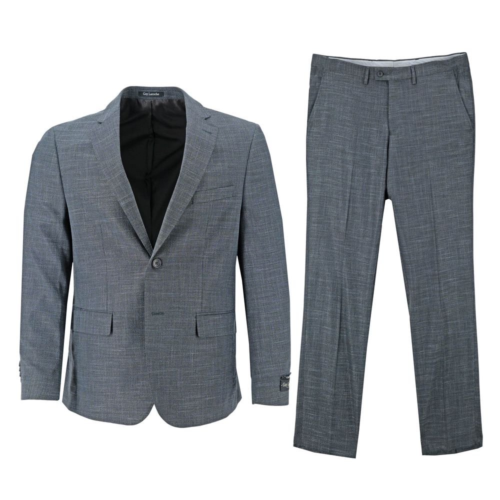 Este traje Guy Laroche de 2 botones jaspeado para caballeros es una prenda elegante y moderna, ideal para el caballero que busca sofisticación y confort en Santo Domingo. Su innovadora composición de poliéster, viscosa y elastano lo convierte en una opción práctica y estilizada para diversas ocasiones.